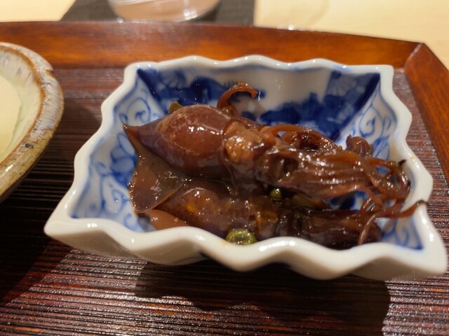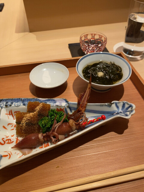 八寸的な感じの酒の肴セット。二十日大根のコノワタ和え、トリガイのヒモとキモを炊いたもの、イカの塩辛、タコのアタマを炊いて桜煮にしたもの、もずく酢のようなものは黒藻酢。引き続きお料理を出していくのでサイドに置いて口直しのように酒肴としてチビチビやってください、と。久我山時代の八寸もこんな感じでチマチマとした酒肴が幾つも出されて酒好きには堪らないものだったことを懐かしく思い出しつつ。