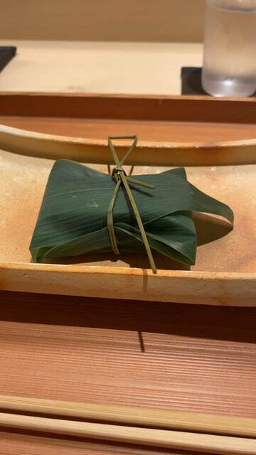 ◯スペシャリテのノドグロの飯蒸し。笹の葉に巻かれて登場。このお店にはもう長く通っているつもりだが、七夕の時期に訪問したのは初めてなのか、ノドグロの飯蒸しが笹の葉に巻かれて出てきたのは初めての経験。