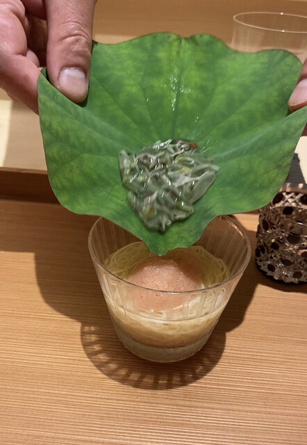 ◯トマト出汁のお素麺。器の上に蓮の葉が乗せられていて、その上にジュンサイ。そのジュンサイを器の中に落とし込んでから頂くという趣向。