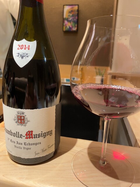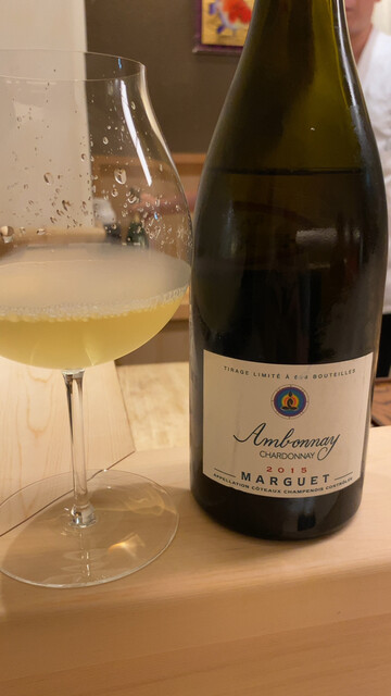 ドリンクはワイン系にしようということで、まずはグラスシャンパン(アンリオのスタンダードキュヴェのもの)、グラス白ワイン(ミシェル・ニーロンのシャサーニュ・モンラッシェ・クロ・ド・ラ・マルトロワ2019年)、そしてドルーアン・ラローズのボンヌ・マール2011年をボトルでいただいた。