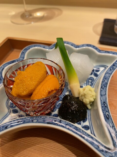 酒のアテにピッタリな八寸(二十日大根を軽くコノワタで和えたもの、うど(上品に甘く炊かれている)、菜の花の胡麻和え、半生の大きなバチコ)を経て、ウニの軍艦寿司かと思わせる一品はナスの上にウニを乗せたもの。