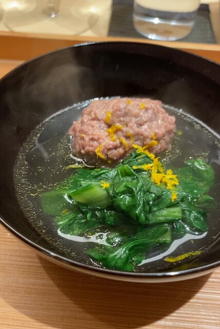 お椀は真鴨、それを骨と一緒に肉団子にしたもので、肉々しさと骨のコリコリ感を感じることのできるもの。あしらいの野菜は菊菜。