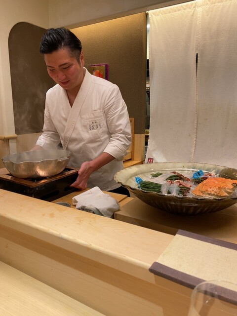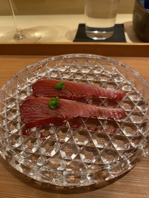 この日は大将と女将さんとが都合によりお休みだったので、久我山時代から長きにわたって大将の脇を固める二番手の方(矢萩さん)が腕を振るう「矢萩ナイト」であった。飲み放題コミコミで25,000円、現金前払いという分かりやすいシステム。カウンターは自分を含めて7名、個室も使われていた。