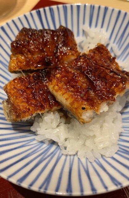 ◯〆のご飯は2種類、一つは鰻の蒲焼を乗せたもの、もう一つは焼いたマスノスケを解したものをたっぷりと白米の上にオンしたもの。