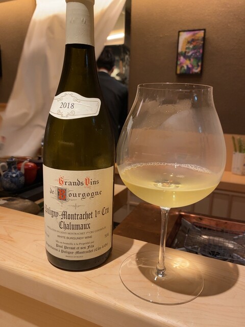 ここから日本酒メインでいくか、ワインメインでいくか、あるいは両方ともいくか、いかようにでもという感じなのだが、自分はワインメインで進めることとして、ここで白ワイン。これまたちゃんとしたもの。ミシェル・ニーロンのシャサーニュ・モンラッシェ2018年。