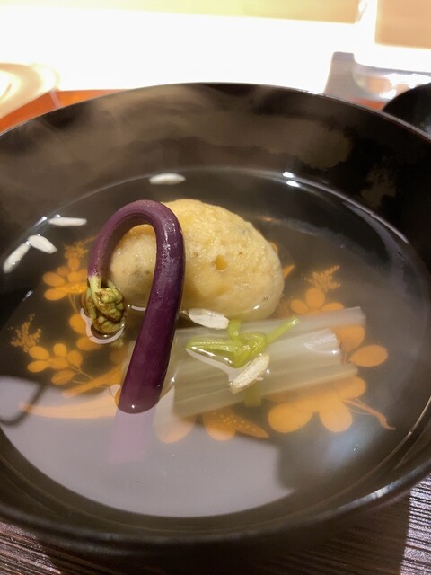 ◯お椀はスッポンかぶら。スッポン出汁のスープのなかに、スッポンと豆腐を真薯にしたものをカブに詰めたもの。その上にスッポンのエンペラが乗せられていた。お出汁はスッポンらしい香りはあるけれどキリッとしている。