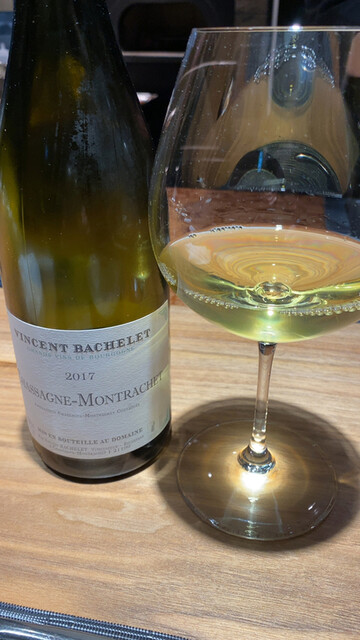 ワインは、グラスで①ブリュン・セルヴネイのメロディ・アン・セー、②ヴァンサン・バシュレのシャサーニュ・モンラッシェ2017年、③ロジェ ・サボンのシャトーヌフ・デュ・パプ・レ・オルヴェ2018年の3杯を、そしてボトルでルシアン・ル・モワンヌのシャルム ・シャンベルタン2013年を頂いた。