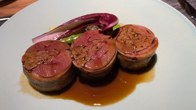 ◯鳩の胸肉のロースト。内臓や肩の肉をミンチにしたものが挟み込まれていた。これをじっくりと炉窯で焼き上げる。とても瑞々しい仕上がり。