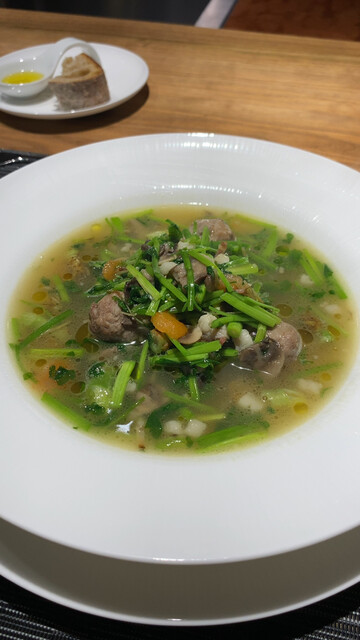 ◯セリとウリボウのミートボールのスープ。これがとても良かった。塩梅が良くて。