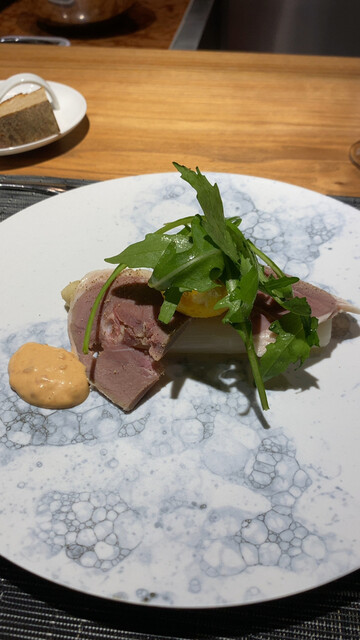 三品目はハモと鴨ナスのお料理。鱧は一度素揚げしてから、パプリカ、ズッキーニ、ナス、ネギ、レンティル豆などと一緒に軽く煮込んだ瑞々しいもので、実山椒ベースのソースと共に。スープではないけどスープのような要素もあって、水分多めのお料理が好きな自分のストライクゾーン。