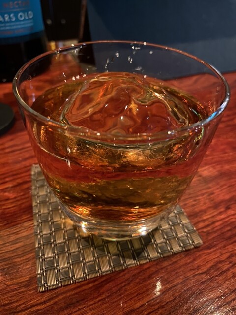 その後、スコッチを2杯、コニャックを1杯、カクテルを1杯いただいた。コニャックは沖縄の骨董品屋さんで見つけて来たものだそうだが、状態もとても良く、かなり美味であった。カクテルは「甘いものを」というだけのオーダーだったのだが、グラン・クラシコ・ビターとかスーズを使ったオリジナルとのこと、こちらもとても良かった。