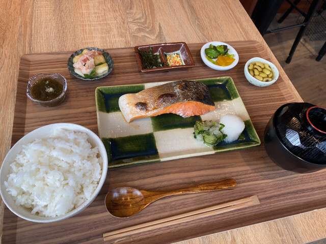 お料理が到着したのは約10分後。鮭の厚みはその名に恥じないもの。しっとりとした焼き具合もお見事だし、塩梅もお見事。小さなオカズも(いい意味で)チマチマとたくさんある。小松菜としめじのお浸しや出汁巻き玉子はどちらかというと薄味でとても上品なお味付け。一瞬、市販の有名商品のように見えたキュウリの新香ものは実は(おそらくこちらのお店オリジナルの)辛子漬け。ピリッとしていていいアクセント。