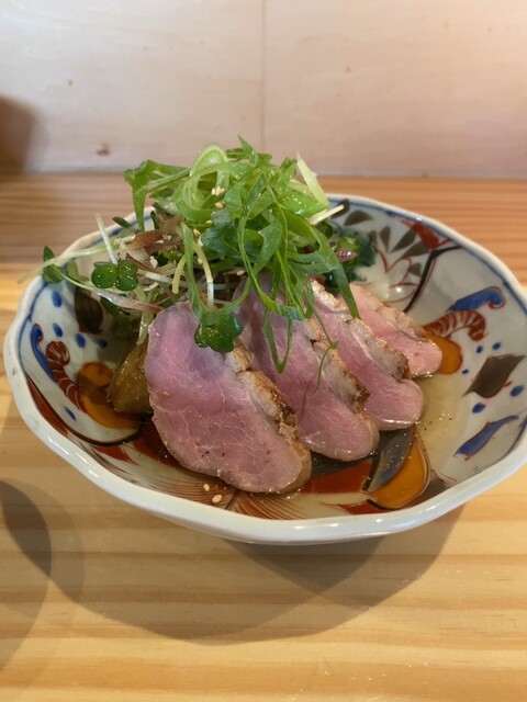 ◯焼き茄子と鴨の冷菜(焼きナスのお浸しと冷製鴨のコンビ、ネギとか三つ葉とか茗荷みたいなものが添えられている。お出汁は焼きナスのものがベースにあって実に良い塩梅)