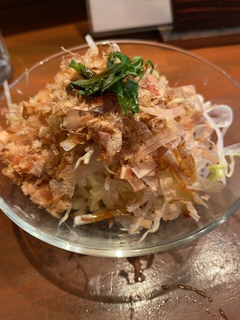 まず登場したのはキャベツの千切りにマヨ和えスパと鰹節が乗せられたサラダ。ごく普通である。