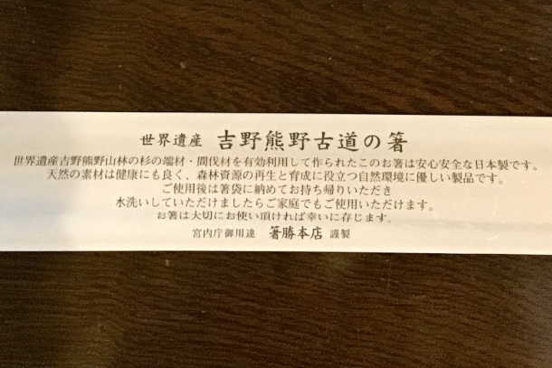 世界遺産吉野熊野古道山林の杉の端材、間伐材を有効利用して作られていて、宮内庁御用達の箸勝本店のお箸だそう。
