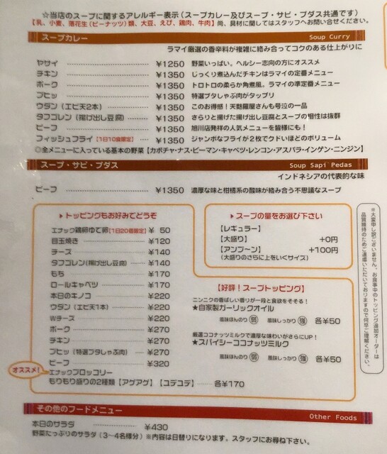 ほかにスープ・サピ・プダス(ビーフ)というメニューもあります。(ジャワ島伝統のスープだそう)