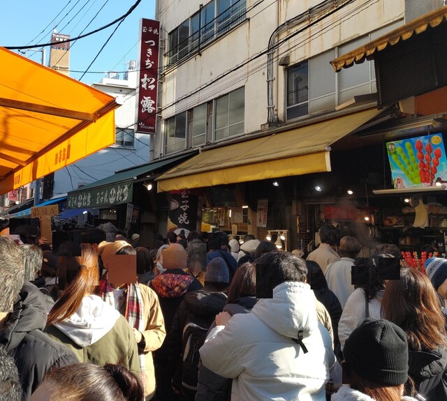 築地市場駅を出ると、場外市場へ向かう道から既に混雑していて、場外市場に入ると買い出し客やインバウンドを含む観光客も多数おられて大混雑。