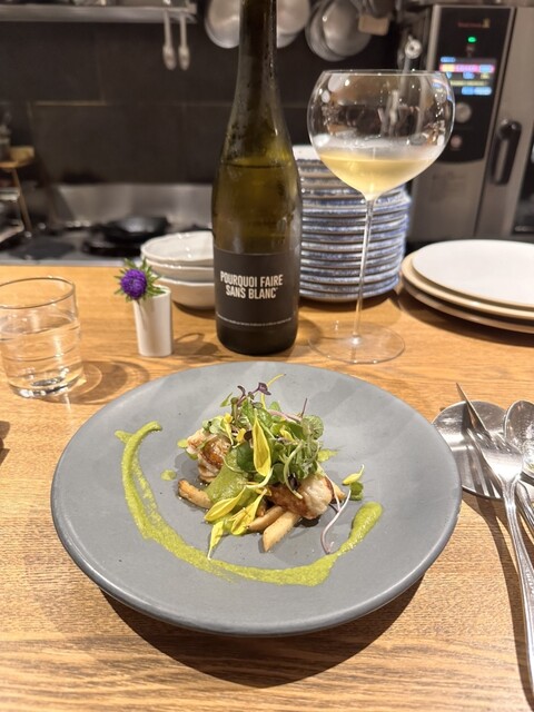 本日の前菜はいちぢくとブルーチーズ、胡桃、はちみつ、ちこりのサラダに90℃の定温で3時間オーブンで焼き、頭までペロリ食べれる鮎を頂きました。普通ならこのサイズの鮎は骨まで食べれません。
