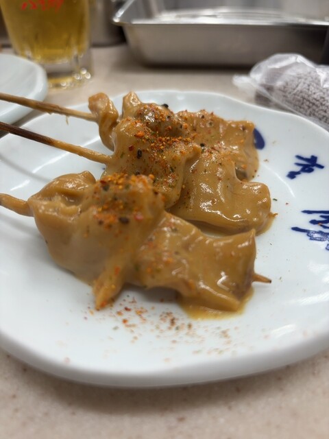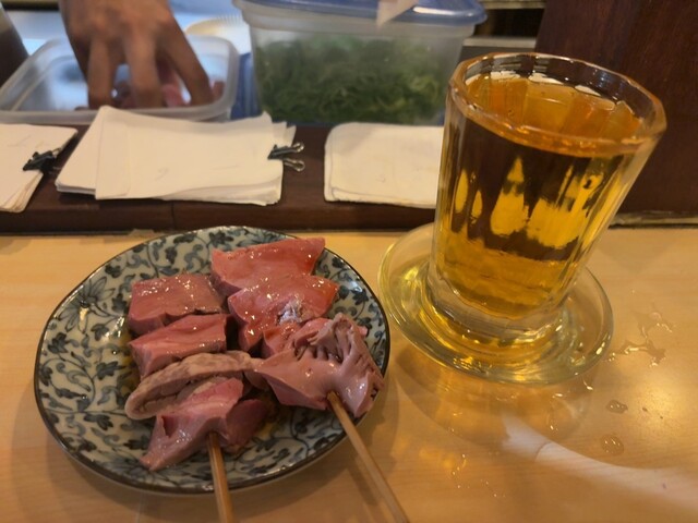 鶏レバーとカシラシオ、生ビール、味玉、マカロニサラダ
