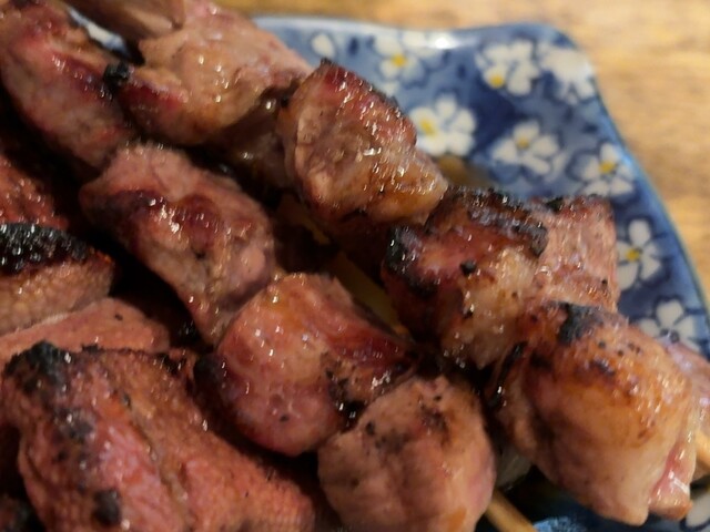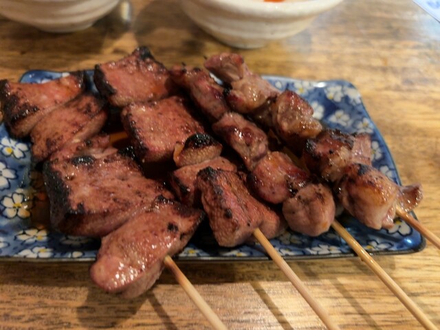 限定の鶏レバーとカシラシオ。鶏レバーは独特の癖があるが美味しい。カシラもこの値段なら満足。