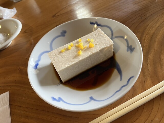 「砂糖いらず」という豆で作った弾力のある歯応えの木綿豆腐。砂糖がいらないほど甘いからという理由らしい。香り付けのゆずがのっている。甘口醤油で頂く。めっちゃ美味い。