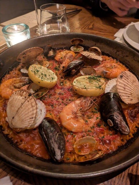 前菜(イチゴのガスパチョ、サバのピンチョス、貝とキヌアのタパス)、パスタかパエリアか選択、デザート(チョコレートアイスとバナナケーキ)、コーヒー。自分はマリスコス(海鮮)のパエリアを選択。