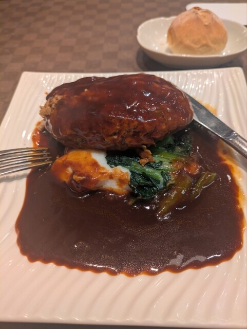 デミグラスソースが甘さの中に酸味も感じられ、オリジナルな美味しさ。ボリューミーなランチ、変わらず旨し。