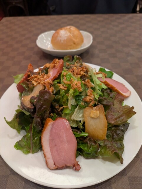 前菜は鴨スモークとエリンギソテー載せサラダ、メインはキャベツ入りハンバーグを選択。ハンバーグの下にほマッシュポテトと青菜のソテー。