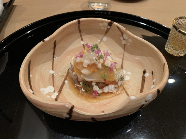 蒸し鮑、生雲丹(稲庭うどん、芽葱、肝ソース、美味出汁ジュレ)