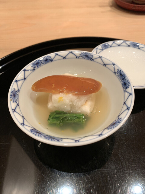 綺麗に澄んだお出汁の中に、4時間かけて蒸した鮑と、昆布湯にさっと通した生鮑。