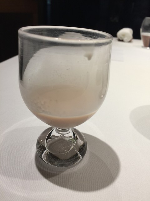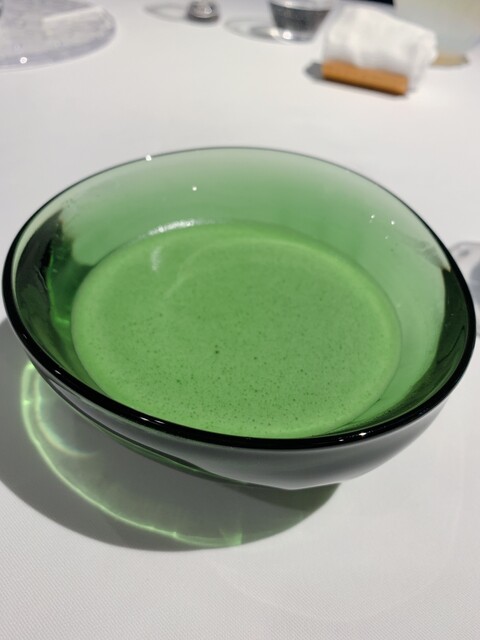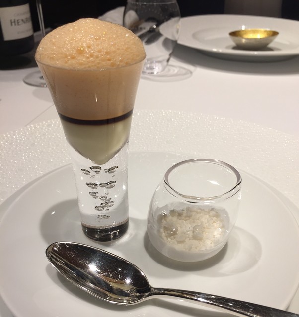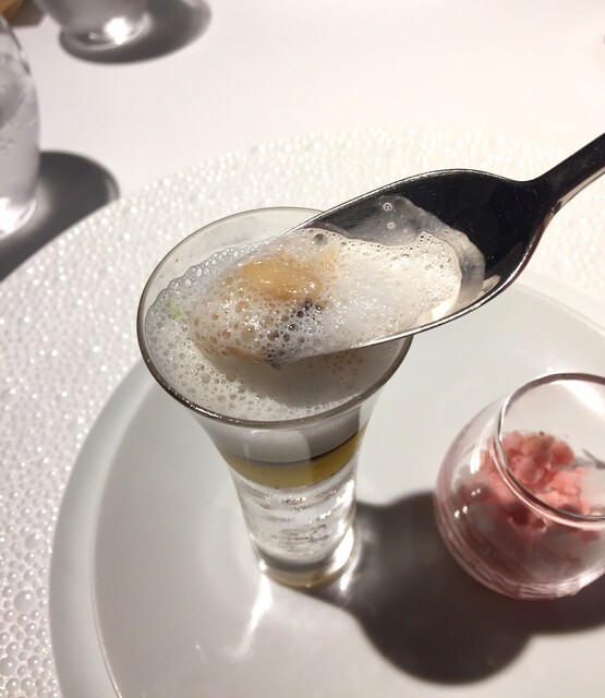 ねっとり感のあるシマエビ、風味豊かなシマエビ出汁の泡、ピュレ状のゆり根の組み合わせ。