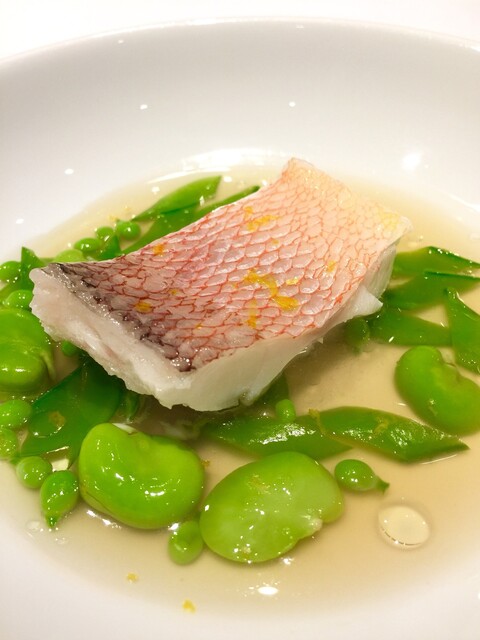 ◆【甘鯛の乳清ポシェ、さまざまな春の豆たち、骨の出汁と柚子】