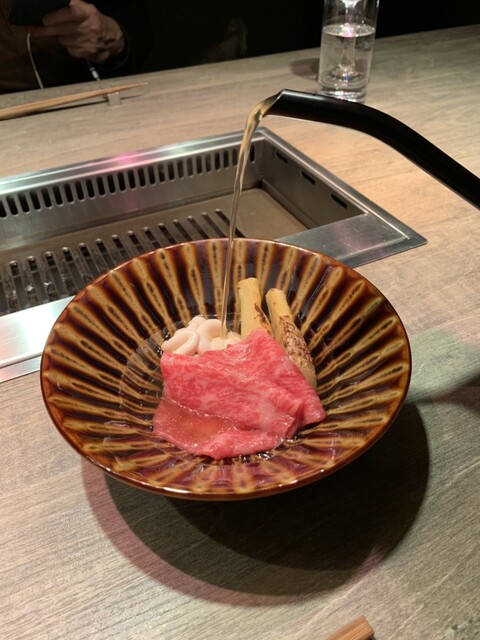 卓上でその器に熱い牛スープをかけ、しゃぶしゃぶ仕立てに。