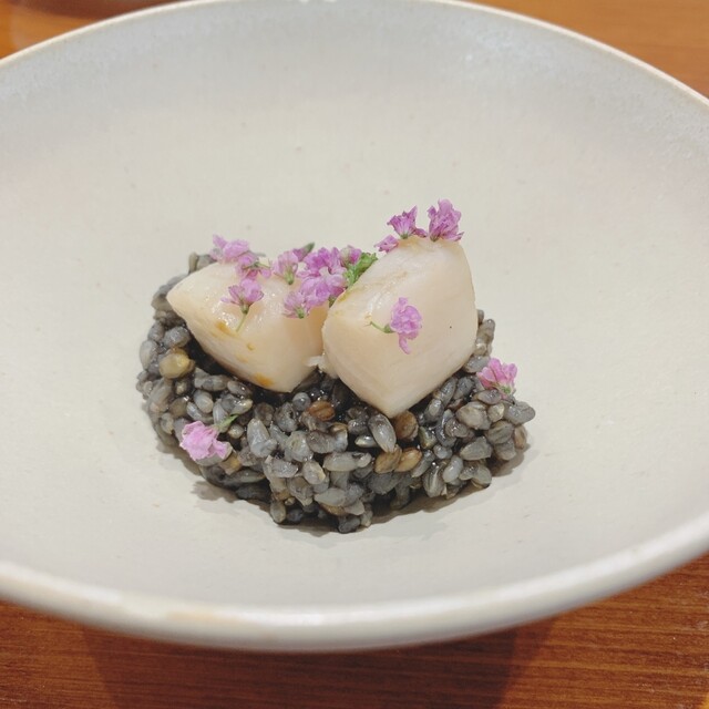 ソテーした平貝、花穂紫蘇添え。