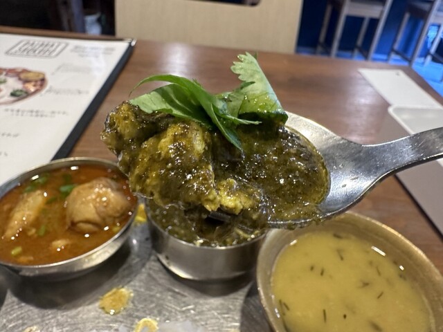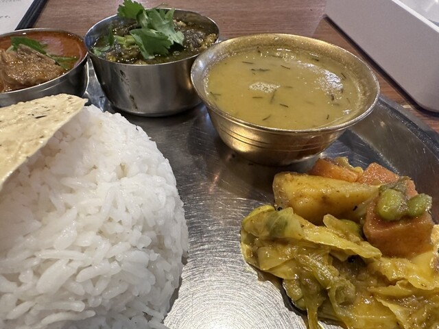 昭和の長屋なのに、店に入ればそこはもうネパール。ダル(豆)とバート(米)の定食をいただきます。組み合わせはいろいろありますが、週替わりとチキンのコンビをお願いします。プレートに並ぶカレーや野菜にソースのようなもの。これらは一体何なんだろうと思いますが、メニューには、プレートのどこに何が配置されているかが絵でわかりやすく説明されているのでネパール料理にはド素人でも安心。お店のおすすめ通りまずは豆のスープ「ダル」からスタート。チキンカレーや週替わりのほうれん草と炒り卵のカレーを交互に混ぜながら、アチャール(大根のアチャール美味しい)とかタルカリとかで味変させながら頂きました。それぞれスパイスなど違った個性がありつつ、あっさりしていて辛さもマイルドですので、とても食べやすい一皿でした。