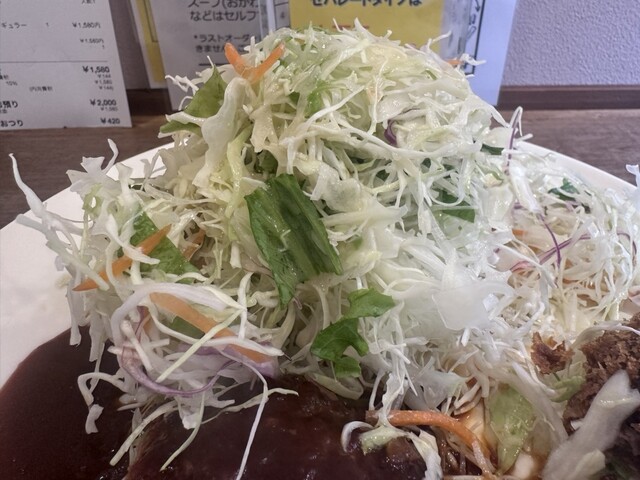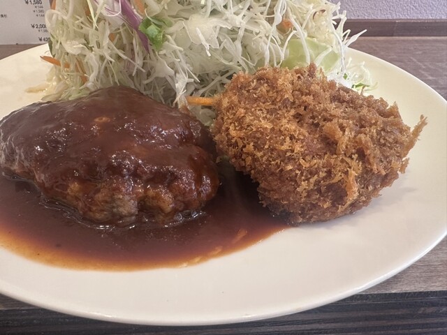 カバー写真にしたのが、箸で割ったハンバーグの断面ですが、この質感どおりの重量感が「さんたべ」さんのハンバーグの醍醐味ですね。玉ねぎゼロ、つなぎ極少の触れ込みどおり粗挽きの牛肉の味が堪能できる逸品です。「さんたべプレート」レギュラーサイズ(ハンバーグとミンチカツ)が1580円でしたが、食べ終わってからお皿を重ねておくと、食後のアイスコーヒーか金券400円分(太っ腹)がもらえるので、実質1180円ですかね。みなさん触れておられる山盛り野菜は手作りマヨネーズでいただきましたが、たっぷり量がありますので種類も豊富なドレッシングで味変しながら楽しめばよかったですね。今回学習したので次回からはぜひトライしてみましょう。ご馳走様でした。おかわりできるポタージュもワンオペの主人の接客ぶりも点数高しです。