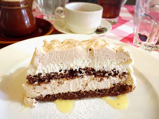 ふわふわでティラミスのよう。スプーンで頂きます。洋酒がすこし効いていて甘さ控え目。口の中で溶けます。おいしい〜!