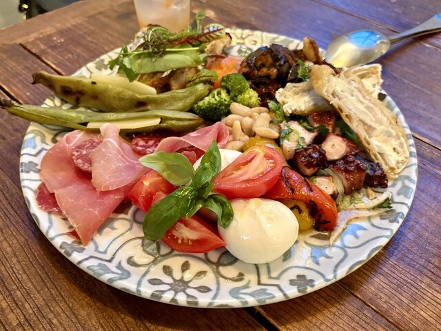 それでまず前菜ですが、大皿に真鰯のブルスケッタ、白身魚とチーズのフリット、ブッラータチーズのカプレーゼ、タコのマリネ、生ハムやサラミ等々、十種くらいの料理が盛り付けられています。
