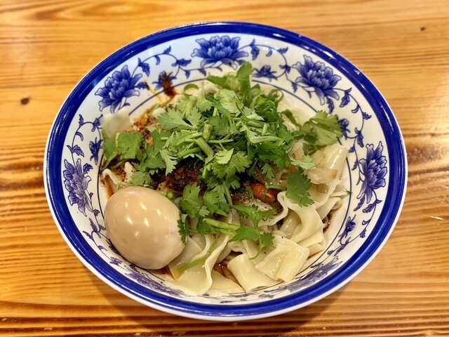注文は「biangbiang麺」税込1000円の大盛り(+150円)の激辛+山椒多めに、茶葉蛋(チャーイエタン)(+150円)とパクチー(+100円)トッピングにしました。