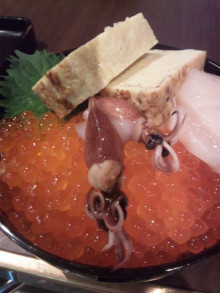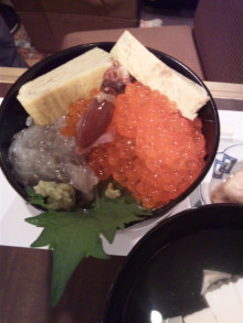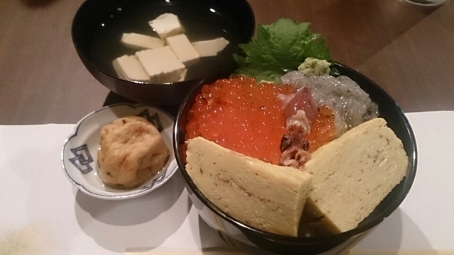 写真の丼が今回の「いくらとだし巻き玉子丼」で、いくらの醤油漬け・だし巻き玉子、生ほたて、ホタルイカが乗っています。ダークチェリーと栗の渋皮煮、コーヒーが付いて1,000円ポッキリ!!! 信じられません!!!