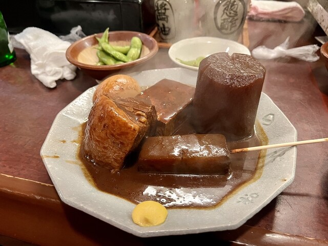 味噌おでん、手羽先、豆腐トロロ、おにぎりをいただきました。