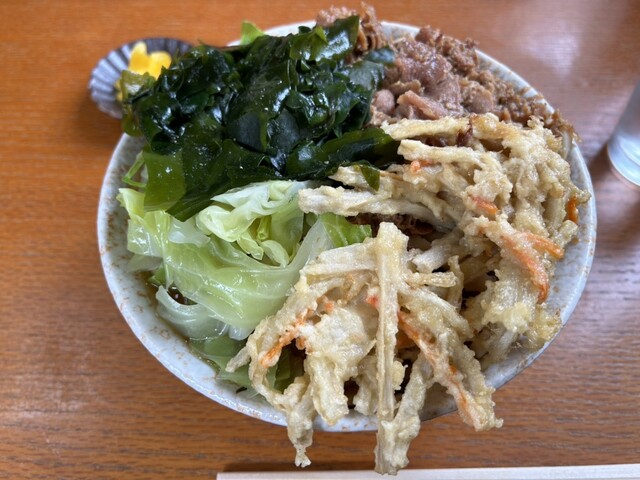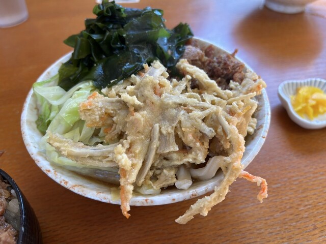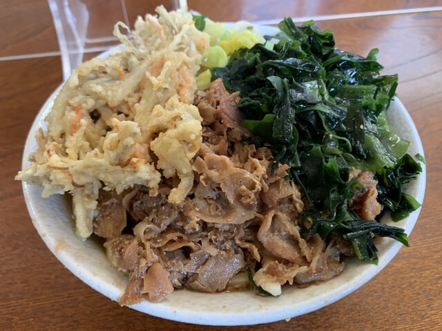 雨で仕事が休みになった息子を連れて3人で、肉天わかめうどん‼️大盛りを私と息子、並盛りを奥様…