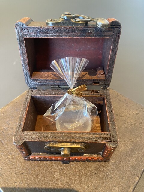 お冷やの氷。ハーブティーを凍らせたもの。地球をイメージ。透明とブルー。急速冷凍で雲を作り。