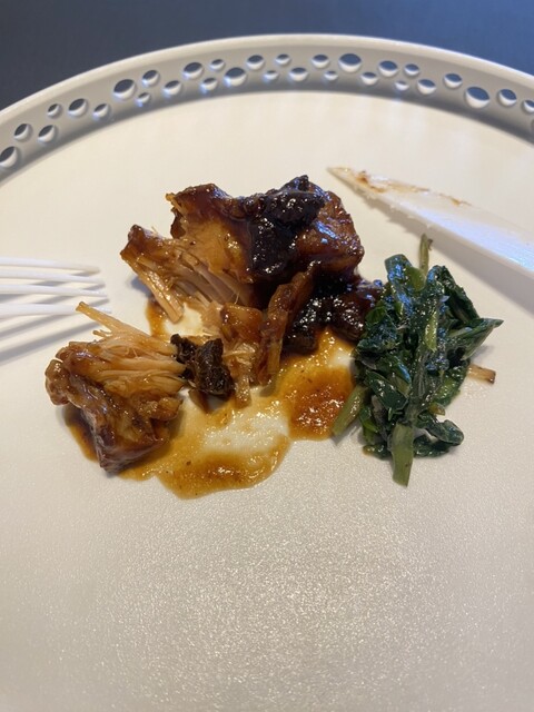 ⑩脂の薄い猪をあえて。佐倉産アミガサだけ、自家製黒苺フルーツビネガー、たんぽぽのはっぱ、猪力強い、甘辛酸味のソース