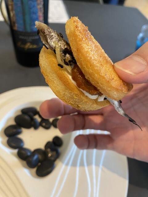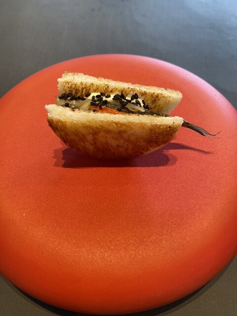 ④(サービス)海釣り。食物連鎖を。カタクチ鰯の胡麻漬け。塩漬け、酢と生姜漬け。一口パニーニ。路地トマトソース。水牛ミルク濃厚ヨーグルト。
