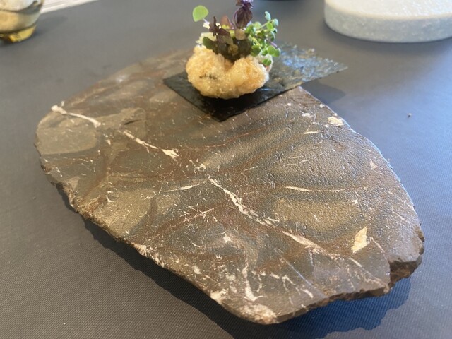 ⑪千葉の石のお皿 鮑の肝のリゾット、アールグレイの自家製ビネガー、蛤のエキスを逃がさないためのフリット、直前まで生きていた蛤、