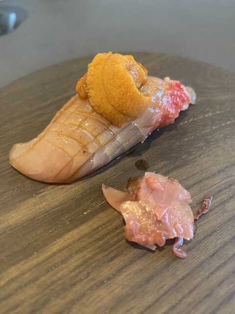 スギ寿司S 金目鯛 雲丹 自家製ローゼルビネガー 鰹の魚醤3年から5年寝かせたもの ピクルス トリュフ風味の卵黄