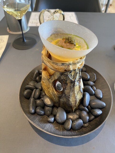 ⑧インパクト勝負のスズキ木乃伊の器、塩で脱水、柚子クリーム、人参柚子ペースト、トマトクリアスープ、キャビア、遊び心満載