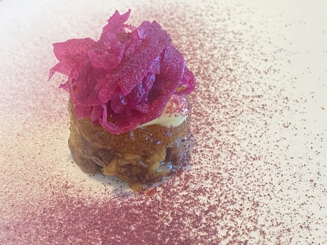 ⑬キョン温製のタルタル、佐倉夏祭りのお好み焼きをイメージ、小麦粉ではなく大根おろしで。ヒバオイルと自家製マヨネーズ、発酵紫キャベツ、発酵キャベツパウダー