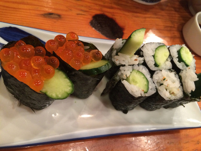 中とろ1貫(¥350)・あなご2貫(¥300)・いくら2貫(¥300)・しまあじ2貫(¥250)・かにみそ2貫(¥300)